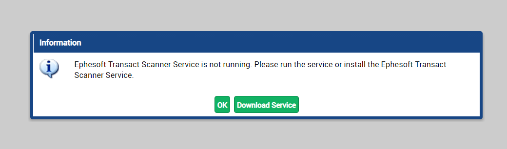“Ephesoft Transact Scanner Service is not running. Please run the service or install the Ephesoft Transact Scanner Service.”