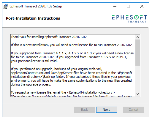 License and Launch Ephesoft Transact 2020.1.02 Perform these steps to complete the upgrade for Ephesoft Transact 2020.1.02.